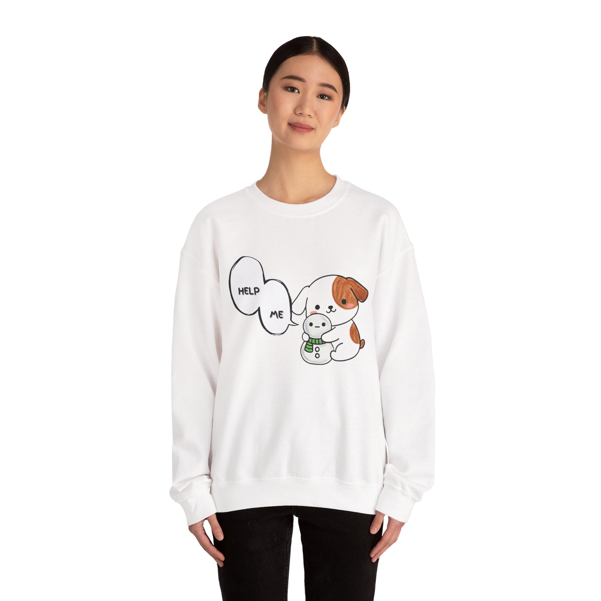 Funny Dog Sweatshirt – “Help Me” Snowman Dog Toy Design, Cute Kawaii Crewneck for Dog Lovers, Cozy Unisex Pullover, Pet Humor Gift