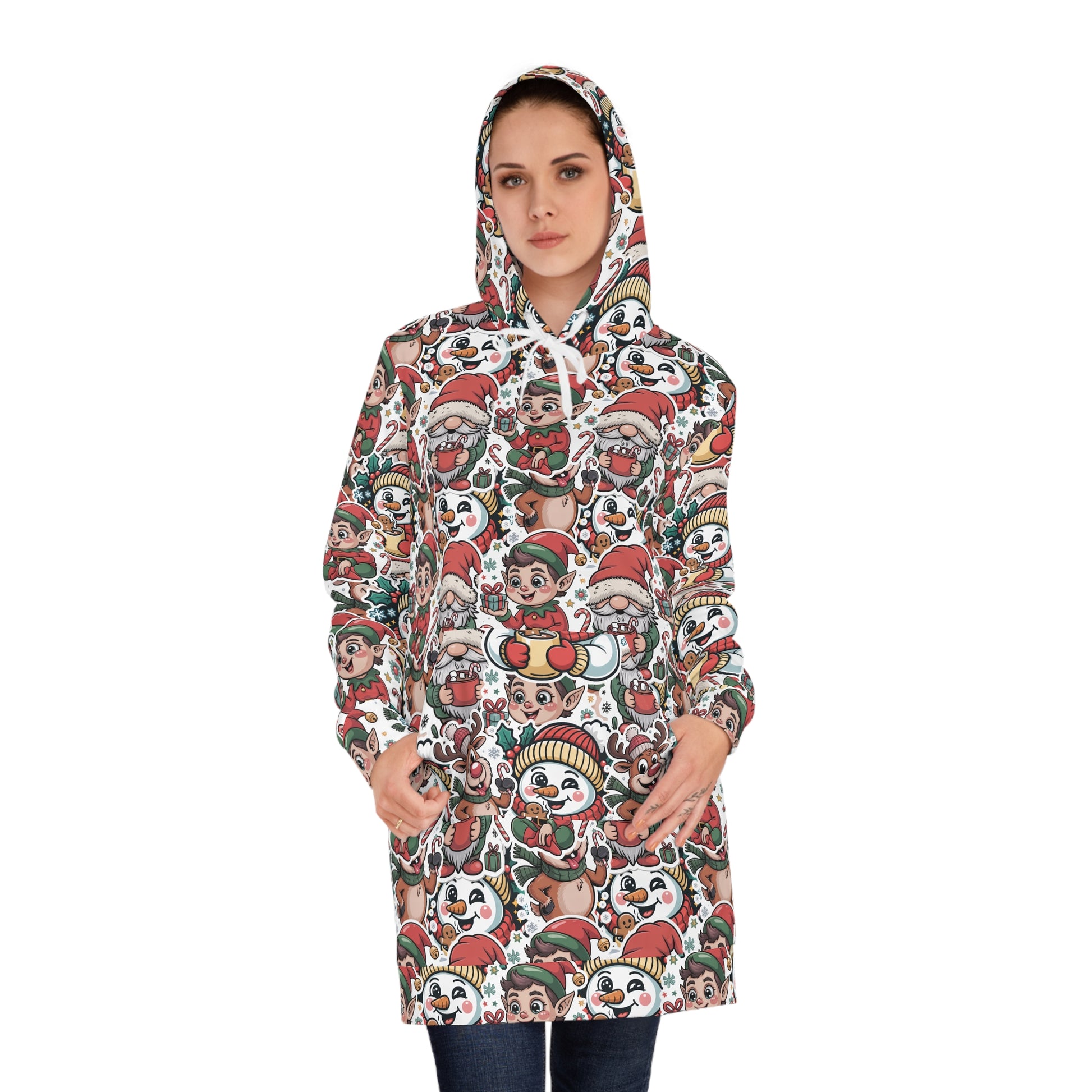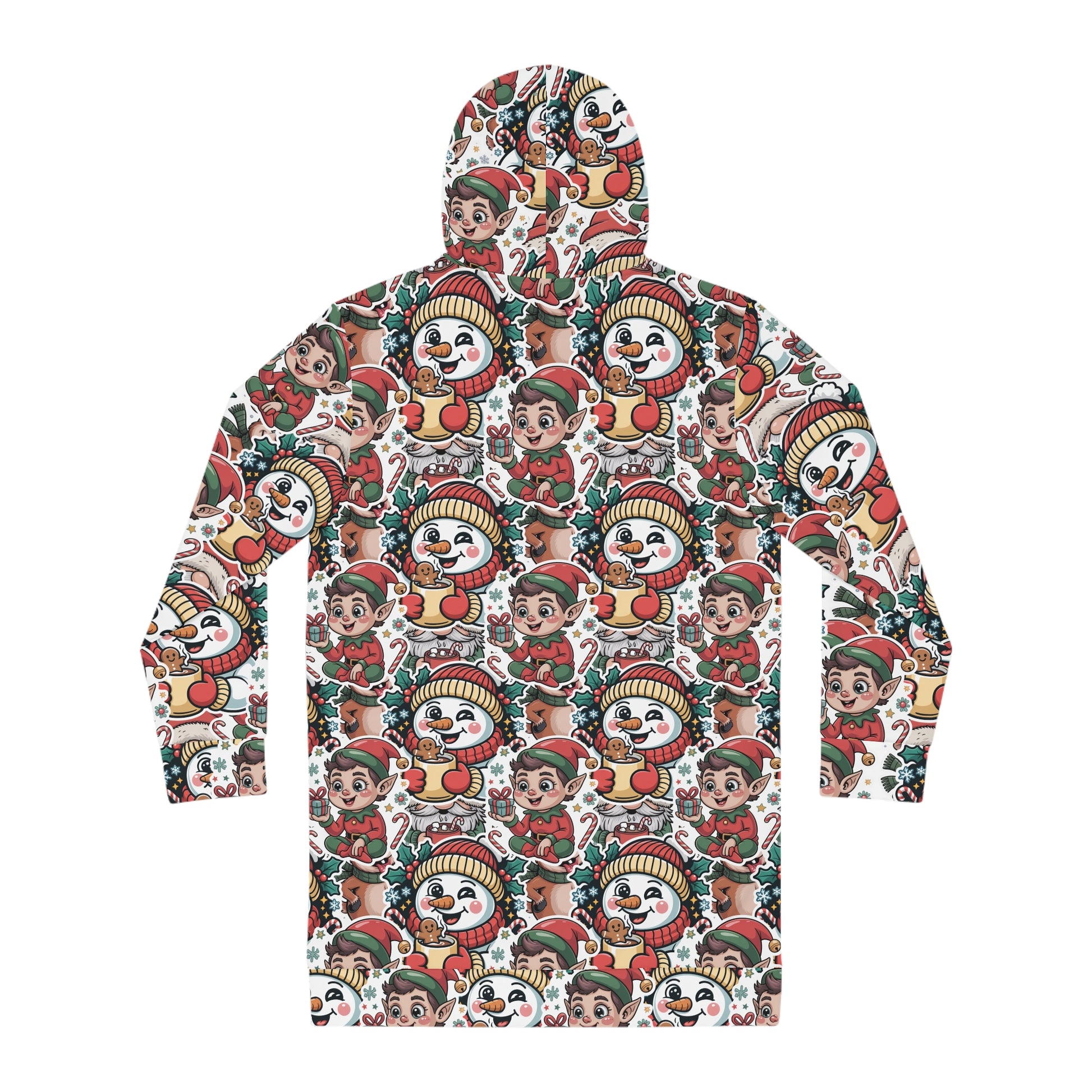 Designed with intentionally over-the-top AI-generated artwork, this all-over print hoodie dress celebrates the wonderfully βtoo muchβ spirit of the season. Featuring Gnome Santa, Cheeky Elf, Melting Face Snowman, and Candy Cane Obsessed Reindeer in a wild festive mashup, itβs a hilarious twist on the classic ugly Christmas sweater β comfy enough for lounging, bold enough for the office party.